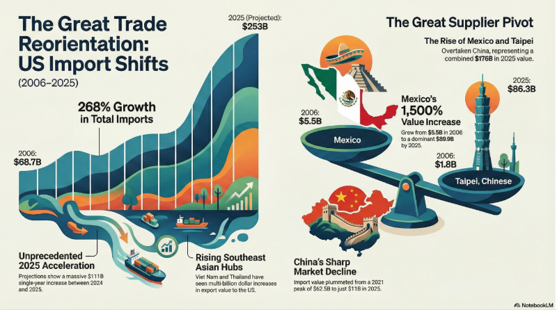 El ajuste reconfigura el comercio exterior del sector tecnológico. México se posicionó como principal proveedor, en un entorno marcado por nearshoring, el fortalecimiento de hubs asiáticos, aranceles diferenciados y redefinición de cadenas de suministro.