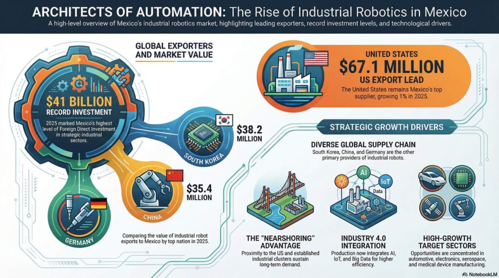 Estados Unidos, Corea del Sur, China y Alemania se ubicaron como los principales exportadores de robots industriales a México en 2025.