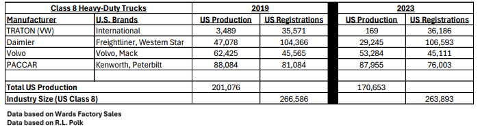 El número de camiones Clase 8 producidos en Estados Unidos disminuyó significativamente entre 2019, el año anterior a la entrada en vigor del T-MEC, y 2023.