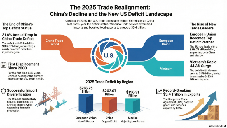 Además, el principal impulsor del déficit comercial general de bienes en Estados Unidos —el déficit comercial con China— se redujo casi una tercera parte en 2025. Por primera vez desde el año 2000, China ya no es el socio comercial con el que Estados Unidos tiene el mayor déficit comercial.