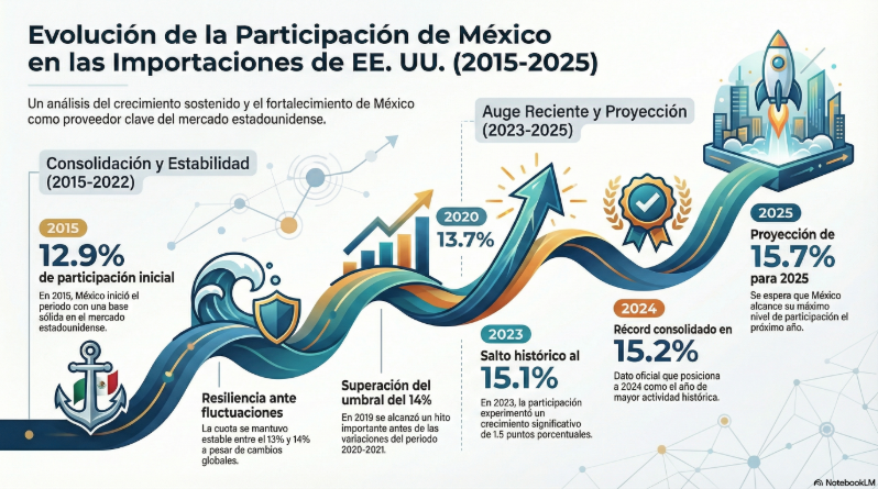 El incremento consolida una tendencia ascendente frente a 12.9% registrado en 2015. En términos interanuales, México amplió su cuota en un contexto global de mayor proteccionismo y ajustes en política comercial estadounidense.