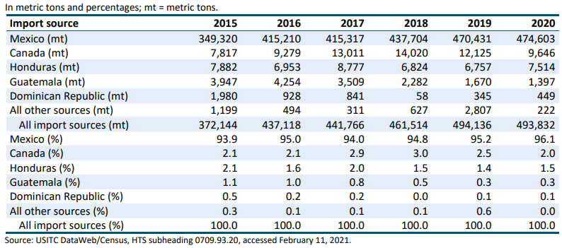 Squash: U.S. imports for consumption, by source, 2015–20