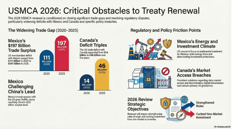Según la USTR, el T-MEC fue un paso relevante para reequilibrar relaciones económicas, aunque persisten problemas estructurales. Estados Unidos sostiene que los déficits con México y Canadá han aumentado desde la entrada en vigor del tratado, lo que obliga a ajustes regulatorios.
