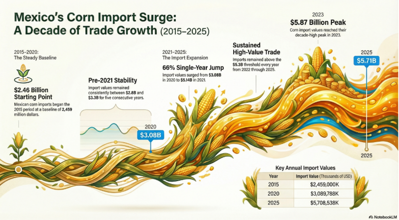 En la última década, las importaciones mexicanas de maíz crecieron 132%, desde los 2,459 millones de dólares en 2015 a 5,709 millones de dólares, de acuerdo con datos de Banxico. Aunque este último dato es menor a las exportaciones estadounidenses de este grano al mercado mexicano, según estadísticas del USDA.