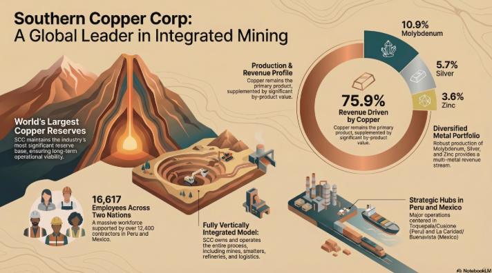 Southern Copper Corporation is one of the largest integrated producers of copper, molybdenum, zinc, and silver. With operations in Peru and Mexico, it has the largest copper reserves in the world. It is a subsidiary of Grupo Mexico.