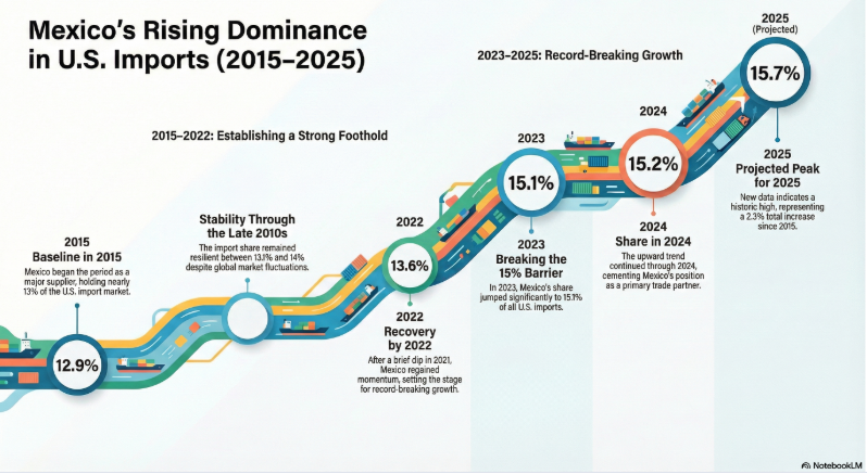 Cette augmentation consolide une tendance à la hausse par rapport aux 12,9 % enregistrés en 2015. En termes annuels, le Mexique a augmenté sa part de marché dans un contexte mondial de protectionnisme accru et d’ajustements de la politique commerciale américaine.