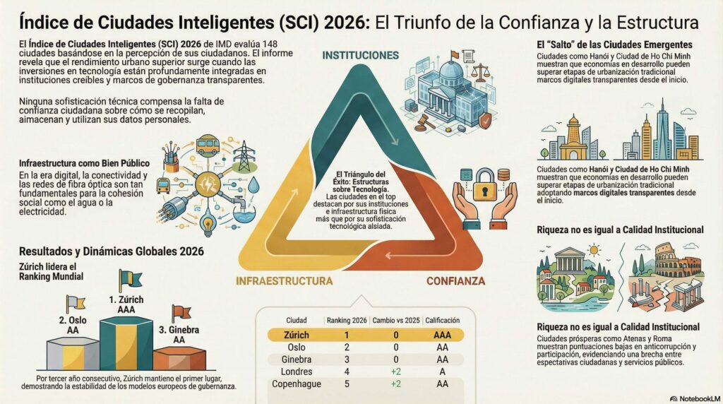 Zúrich mantiene su liderazgo indiscutible al encabezar nuevamente el ranking global de ciudades inteligentes. Su éxito radica en un equilibrio excepcional entre el poderío económico, la tecnología aplicada y la sostenibilidad. Así, garantiza una calidad de vida superior y una confianza ciudadana inquebrantable en sus instituciones.