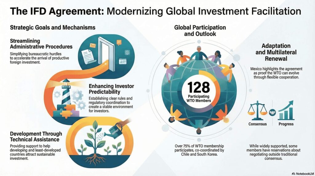 El Acuerdo sobre la Facilitación de las Inversiones para el Desarrollo tiene el objetivo de crear condiciones más previsibles para los inversionistas mediante reglas claras, coordinación regulatoria y asistencia técnica.