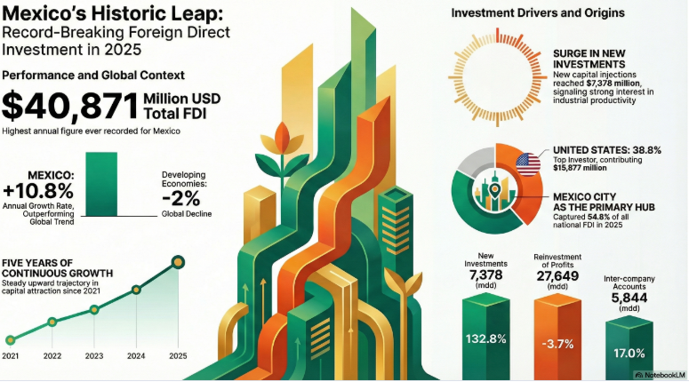 México captó 40,871 millones de dólares de Inversión Extranjera Directa (IED) en 2025, un crecimiento interanual de 10.8%, informó la Secretaría de Economía.