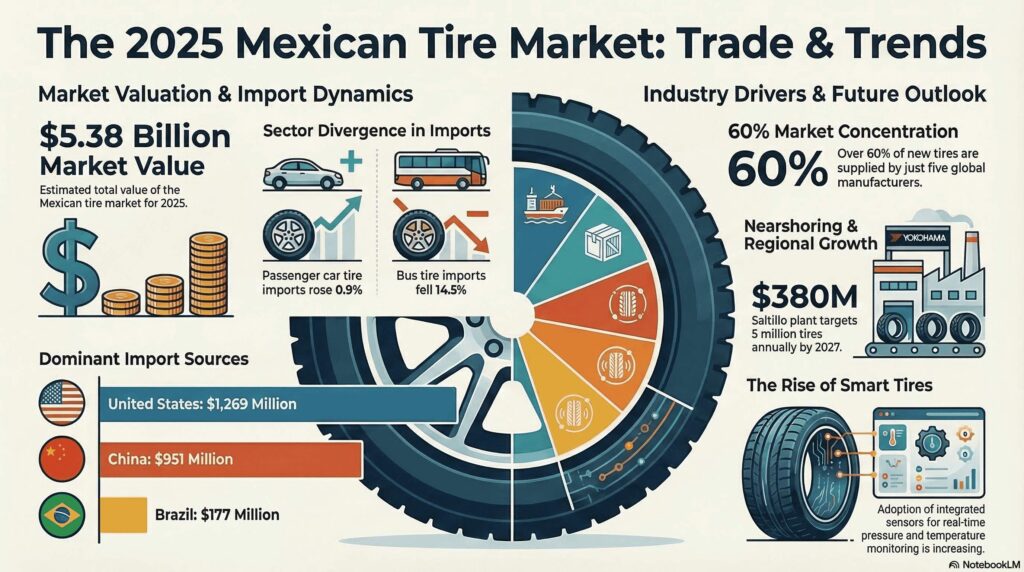 Otros proveedores externos de neumáticos en el mercado mexicano en 2025 fueron Brasil (177 millones de dólares), Corea del Sur (88 millones) y Canadá (45 millones).